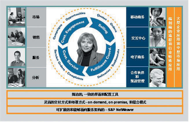 mySAP CRM不僅包含了企業(yè)市場營銷、銷售、服務(wù)、分析等功能,還通過渠道伙伴、現(xiàn)場和移動商務(wù)、交互中心、電子商務(wù)等各種交互渠道形成完整的閉環(huán)式設(shè)計(jì)的解決方案。在提供深入的行業(yè)應(yīng)用和傳統(tǒng)的部署方式的同時(shí),mySAP