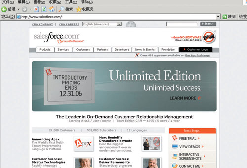 2004年7月,Salesforce剛上市時(shí),股票交易價(jià)為11美元。最近一個(gè)月,它的股價(jià)則在40美元附近徘徊。成立7年多的Salesforce.com在全世界的2.48萬個(gè)公司擁有超過50.1萬個(gè)用戶,并以每年80%的速度增長(zhǎng),客戶滿意度高達(dá)97%。