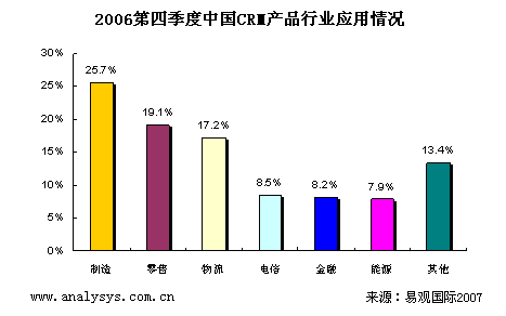 易觀國際研究表明,中國CRM產(chǎn)品市場2006年第4季度總體市場規(guī)模達到0.81億人民幣,季度增長率達到4.2%,體現(xiàn)了穩(wěn)健增長的趨勢。具體廠商方面,TurboCRM,Oracle(甲骨文),SAP位居領先地位。