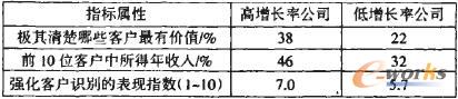 對(duì)《財(cái)富》雜志排名前l(fā)000位公司的200位經(jīng)理調(diào)查后得出結(jié)論,企業(yè)增長(zhǎng)性與清楚的識(shí)別客戶(hù)有明顯的聯(lián)系(見(jiàn)表1)。該表反映了高增長(zhǎng)率的企業(yè)比低增長(zhǎng)率的企業(yè)更加懂得客戶(hù)識(shí)別的重要性,并運(yùn)用技巧來(lái)強(qiáng)化核心客戶(hù)為企業(yè)創(chuàng)造更多價(jià)值。