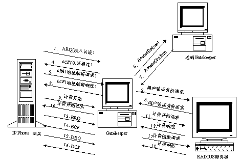 2、用戶認(rèn)證:網(wǎng)關(guān)用ARQ把用戶卡號(hào)和密碼發(fā)給網(wǎng)守,網(wǎng)守再把卡號(hào)和密碼送給計(jì)費(fèi)認(rèn)證中心,如果計(jì)費(fèi)認(rèn)證中心認(rèn)證通過(guò),網(wǎng)守向網(wǎng)關(guān)發(fā)ACF,否則回ARJ。