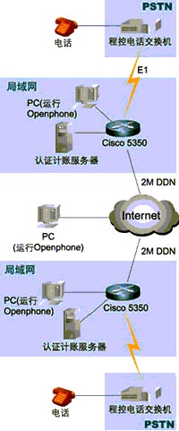 組成這個(gè)IP電話的網(wǎng)絡(luò)系統(tǒng)由處于兩個(gè)不同國(guó)家的區(qū)域組成(見(jiàn)附圖1網(wǎng)絡(luò)拓?fù)浣Y(jié)構(gòu)),每個(gè)區(qū)域都采用了一臺(tái)Cisco 5350路由器(以下簡(jiǎn)稱5350)作為網(wǎng)絡(luò)的核心,這臺(tái)5350路由器具有兩個(gè)WAN口和兩個(gè)以太網(wǎng)口,能夠直接連接到本地的局域網(wǎng)和DDN基帶調(diào)制解調(diào)器。和普通電話網(wǎng)絡(luò)(PSTN)相連接則是通過(guò)添加一個(gè)E1接口卡4PRI和一個(gè)IP語(yǔ)音數(shù)據(jù)處理單元NP60,來(lái)實(shí)現(xiàn)E1(30條ISDN的B信道)和路由器相連接,實(shí)時(shí)地對(duì)語(yǔ)音數(shù)據(jù)進(jìn)行H.323壓縮編碼。
