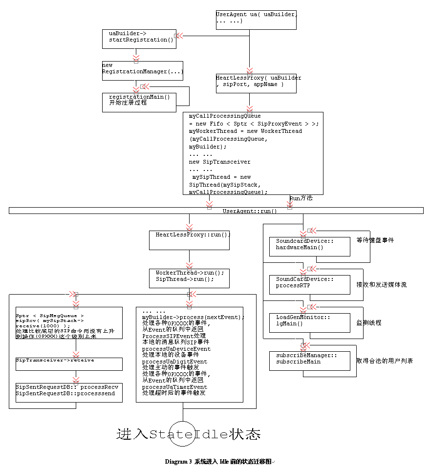 構建User Agent的工作已經完畢,現在應該讓調用它的Run方法了;從下面的程序可以看到,Run方法的調用,讓整個程序進入一種"Idle"的狀態(tài),等待命令輸入和狀態(tài)的產生,這個過程我們可以看到在Ua.CXX的Main程序中調用(ua.run())。