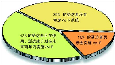 該調(diào)查收集了全球254名高級管理人員對未來企業(yè)網(wǎng)絡(luò)的意見和看法。其中,43%的受訪者表示,他們正在使用、測試或計劃在未來兩年內(nèi)實施VoIP;另外 18% 的受訪者表示,從長遠(yuǎn)的角度來講,他們會實施 VoIP。市場預(yù)測也顯示相同的樂觀前景。研究機構(gòu)Gartner Dataquest預(yù)期到2008年,公用電話交換網(wǎng) (PSTN) 的零售語音收入將輕微下跌,而VoIP的零售收入則上升 38.6%。