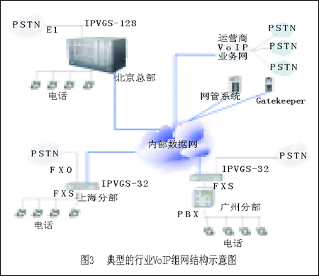 我國(guó)現(xiàn)有很多擁有自己專(zhuān)網(wǎng)的行業(yè),比如金融、能源和一些政府機(jī)構(gòu),它們正是通過(guò)這樣的方案來(lái)實(shí)現(xiàn)內(nèi)部通話的。這些行業(yè)目前也正是中國(guó)VoIP市場(chǎng)的主力,由于行業(yè)用戶的規(guī)模很大,目前中國(guó)的很多行業(yè)實(shí)際上都有一套運(yùn)營(yíng)級(jí)的VoIP網(wǎng)絡(luò)。圖3是一個(gè)典型的行業(yè)VoIP組網(wǎng)結(jié)構(gòu)圖。