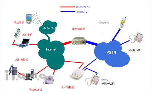 IP網(wǎng)絡(luò)電話(huà)和普通(PSTN)電話(huà)到底是怎么樣解決互通問(wèn)題的呢?下面的我們?cè)敿?xì)的探討這個(gè)問(wèn)題。我們都知道,互聯(lián)網(wǎng)與普通的電話(huà)網(wǎng)絡(luò)是不同的兩個(gè)網(wǎng)絡(luò),要是實(shí)現(xiàn)IP網(wǎng)絡(luò)電話(huà)和普通(PSTN)電話(huà)互通就必須使用一種設(shè)備連接這兩個(gè)網(wǎng)絡(luò)。如下圖所示: