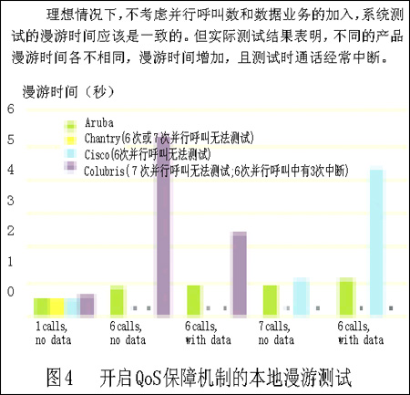 Aruba公司的設備在漫游測試中表現(xiàn)出色,它的平均漫游切換時間在0.5~1秒之間,雖然這已經(jīng)是所有的測試設備中表現(xiàn)最好的,但是通話者還是能夠察覺這種時延。而Cisco公司的設備,由于時間的限制,我們只進行了7個并行呼叫的漫游測試,平均漫游時間為0.433秒到1.053秒,而加入數(shù)據(jù)流業(yè)務時,在7個并行VoIP呼叫時,系統(tǒng)的時延達到了4.324秒。