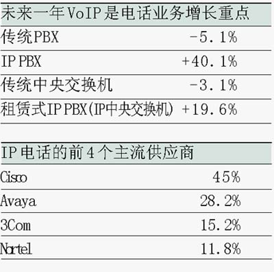 事實(shí)上,北美市場的實(shí)際銷售量已經(jīng)表明,市場中的傳統(tǒng)語音交換機(jī)銷售量已經(jīng)在明顯下降,而具備IP功能或純IP系統(tǒng)的銷售量卻在穩(wěn)步上升。Gartner 預(yù)計(jì),2005年在北美地區(qū)銷售的純IP系統(tǒng)總價值將高達(dá)9.03億美元,比2004年的6.86億美元上升32%。同時,傳統(tǒng)電路交換系統(tǒng)的銷售量將從2004年的14億美元下降至9.99億美元,下降的幅度是32%。而混合式系統(tǒng)的銷量增長幅度可望達(dá)到30%,也就是說,從2004年的1.5億美元增長到2005年的2億美元。