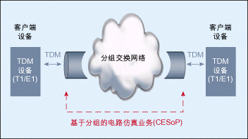 CESoP的基本思想就是在分組交換網(wǎng)絡(luò)上搭建一個(gè)“通道”,在其中實(shí)現(xiàn)TDM電路(如T1或E1),從而使網(wǎng)絡(luò)任一端的TDM設(shè)備不必關(guān)心其所連接的網(wǎng)絡(luò)是否是一個(gè)TDM網(wǎng)絡(luò)。分組交換網(wǎng)絡(luò)被用來(lái)仿真TDM電路的行為,故而稱為“電路仿真”(圖1)。