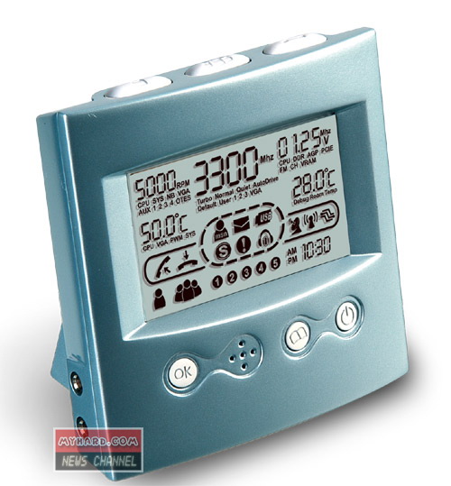這個裝置,其實是一項早期工具的衍生產(chǎn)品。早在2004年,這個具有獨立顯示屏的小東西被開發(fā)出來,用以控制電腦的超頻設(shè)定并監(jiān)控系統(tǒng)的效能。現(xiàn)在這個在下周起于各大通路都買得到的新機種已納入Skype話務(wù)管理功能,使用者可直接把頭戴式耳機接到這個小時鐘上,one-touch輕輕一按,便可立即進行接通電話、速簡撥號及電話會議。