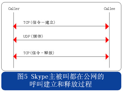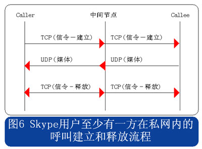 從上述流程圖可見,Skype的呼叫信令都采用TCP封裝,而媒體流則使用UDP封裝,當(dāng)有任何一方用戶位于限制UDP包的防火墻內(nèi)時(shí),媒體流就會(huì)采用TCP封裝。另外當(dāng)Skype用戶至少有一方位于私網(wǎng)內(nèi)時(shí),所有的信令和媒體消息都經(jīng)過(guò)一個(gè)或多個(gè)中間節(jié)點(diǎn)轉(zhuǎn)發(fā)。此時(shí)無(wú)需擔(dān)心用戶通話的媒體流因?yàn)榻?jīng)過(guò)中間節(jié)點(diǎn)轉(zhuǎn)發(fā)而被竊聽,因?yàn)镾kype采用了對(duì)消息進(jìn)行端到端加密的機(jī)制。