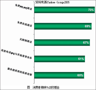 市場(chǎng)調(diào)研咨詢公司Yankee Group日前針對(duì)消費(fèi)者進(jìn)行了一次調(diào)查,結(jié)果顯示:73%的用戶喜歡VoIP是因?yàn)橥ㄟ^它可以進(jìn)行免費(fèi)的PC對(duì)PC通話;69%的用戶喜歡VoIP在線呼叫的功能;67%的用戶表示,VoIP廉價(jià)的通話費(fèi)用使人們可以無限制地通話,令人心動(dòng);61%的用戶表示,喜歡通過VoIP使電話與PC、其他在寬帶網(wǎng)絡(luò)上的一些活動(dòng)捆綁起來;60%的用戶表示被服務(wù)提供商提供的優(yōu)惠套餐吸引。對(duì)于用戶來說,VoIP最大的吸引力似乎在于其低廉的話費(fèi)和為人們帶來的方便。
