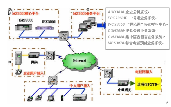 MS3000基于NGN交換技術,在以軟交換技術為基礎的呼叫控制中心平臺上提供獨立的、多種形式的電信增值業(yè)務。