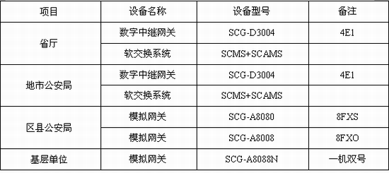 在區(qū)縣局,可采用數(shù)字E1中繼網(wǎng)關(guān)SCG-D3004或采用模擬語(yǔ)音網(wǎng)關(guān)(SCG-A8000);當(dāng)話務(wù)量不是很高時(shí),可采用模擬語(yǔ)音網(wǎng)關(guān)與用戶原有的