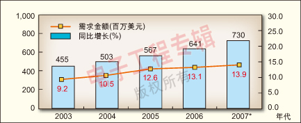 5.IP電話信號轉換設備市場需求將不斷增長。2006年,中國大陸IP電話信號轉換設備的總需求規(guī)模為6.41億美元,同比增長13.1%;預計今年的總規(guī)模將達7.3億美元,同比增長13.9%(見圖6)。