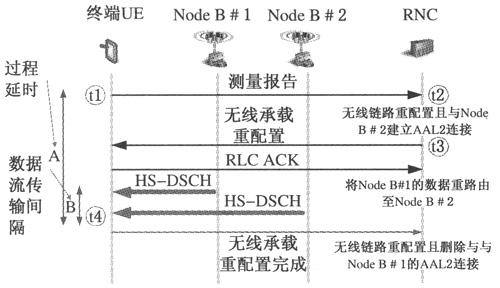 圖2中,傳輸時(shí)間間隔用時(shí)刻B表示,該時(shí)間可以忽略,因?yàn)閁E從源小區(qū)到目標(biāo)小區(qū)的切換是與網(wǎng)絡(luò)同步的。因此,對(duì)于像VoIP這樣的低延時(shí)實(shí)時(shí)業(yè)務(wù)來說,HSPA可以提供無縫的移動(dòng)性。