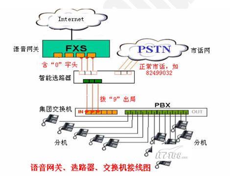 使用網(wǎng)關(guān)電話打國內(nèi)/國際其他普通公話或手機,稱為“點對面模式”。在使用智能路由選線器以后,打出電話時自動根據(jù)首位字頭,例如“0”,判斷選擇市話或者VOIP專線通話,--字頭有“0”,時自動走VOIP網(wǎng)絡(luò)線路,字頭沒有“0”時,選擇走通常的市話線路,完全不改變我們過去使用電話的習(xí)慣!