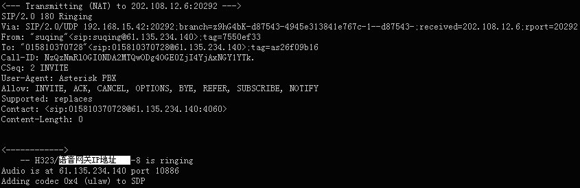 表示軟交換Asterisk與華為8010語音網關的H323連接已經成功建立
