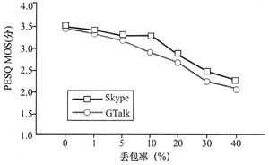 MOS方法評估了它們語音質(zhì)量的優(yōu)劣。通過實(shí)驗(yàn)可知:在理想的網(wǎng)絡(luò)狀況下,Skype表現(xiàn)得更好一些(兩者PESQ MOS的分?jǐn)?shù)差別為0.1),總體而言它們的語音質(zhì)量還是較為接近。在網(wǎng)絡(luò)有較長的時(shí)延時(shí),Skype有不必要的適應(yīng)性。當(dāng)丟包情況發(fā)生時(shí),GTalk沒有實(shí)施任何機(jī)制來提高其性能,與此同時(shí),Skype使用數(shù)據(jù)冗余機(jī)制來對抗丟包以提高其語音質(zhì)量。在抖動情況發(fā)生時(shí),兩者都沒有很好的機(jī)制來提高其適應(yīng)性。當(dāng)有較長的時(shí)延時(shí),PESQ