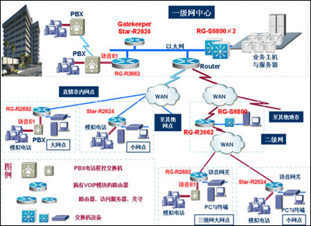 3、銳捷26系列VOIP路由器支持Gatekeeper功能,通過(guò)簡(jiǎn)單的配置連接到關(guān)守(Gatekeeper)上就可以與全省各地進(jìn)行VOIP連接,而省略了煩瑣的靜態(tài)撥號(hào)對(duì)等體的配置,方便而高效。