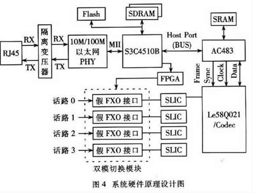 本節(jié)提出了一種基于H.323的雙模網(wǎng)關(guān)的系統(tǒng)設(shè)計方案,該方案支持4路話音,使用一種經(jīng)濟實用的“假FXO接口”方式實現(xiàn)雙模切換,能夠在VoIP通話時檢測到PSTN線上進(jìn)來的呼叫并可通過按話機的拍簧或者Flash閃斷鍵切換接聽。