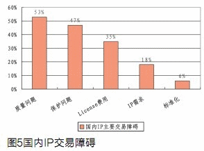 根據(jù)我們對92家芯片設(shè)計(jì)企業(yè)的問卷調(diào)查,IP質(zhì)量、IP保護(hù)和IP費(fèi)用是目前國內(nèi)IP核交易中的主要障礙。(見圖5)