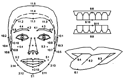 現(xiàn)在運(yùn)行的系統(tǒng)中多為參數(shù)控制系統(tǒng),其中控制參數(shù)也多采用MPEG-4所定義的人臉動(dòng)畫(huà)參數(shù)(facial animation parameter,FAP)。MPEG-4制定了一整套人臉模型化描述方法,包括用于定義人臉模型的面部定義參數(shù)(facial define parameters,FDP)和一組用于定義人臉面部動(dòng)作的人臉動(dòng)畫(huà)參數(shù)FAP。其中FDP通過(guò)對(duì)人臉上84個(gè)特征點(diǎn)的位置信息來(lái)定義人臉模型,這些點(diǎn)不僅包括外表看得見(jiàn)的人臉特征點(diǎn),還包括了舌頭、牙齒等口腔內(nèi)器官的特征點(diǎn),如圖1所示。