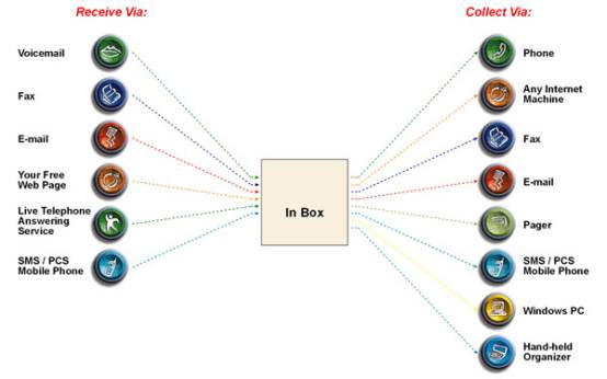 Ø 由固定/移動(dòng)電話運(yùn)營(yíng)商、ISPs 以及ASPs提供服務(wù)。服務(wù)包括單一信息通知到完全統(tǒng)一信息。用戶可將其所有類型的信息存儲(chǔ)在一個(gè)信箱中并且通過(guò)電話或網(wǎng)絡(luò)瀏覽器獲取。