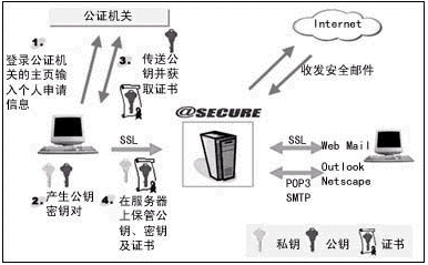 簡單來說,PKI就是由發(fā)布機(jī)構(gòu)發(fā)布證書給PKI的用戶,證書中含有用戶公共密鑰和個人密鑰的信息,由證書、證書授權(quán)機(jī)構(gòu)CA和實體三部分組成。PKI的用戶利用個人密鑰簽發(fā)信息或解密收到的信息,而其他用戶則使用對應(yīng)公共密鑰收發(fā)信息。基于PKI的設(shè)計,采用統(tǒng)一的證書分配、管理策略以及共同的可靠性驗證機(jī)制,一方面可以保證E-mail的安全性,另一方面還可以解決現(xiàn)有不同系統(tǒng)無法進(jìn)行通信的弊病。因此,現(xiàn)有推出的一些優(yōu)秀E-mail系統(tǒng)如3R Soft推出的@SECURE都是基于PKI進(jìn)行設(shè)計的。通過數(shù)據(jù)加密的辦法只能保證郵件的機(jī)密性,卻無法完全保證郵件的完整性和不可抵賴性,即不能保證郵件在傳輸過程中不被他人篡改,且不被人冒名頂替發(fā)送。數(shù)字簽名可以有效地阻止這一現(xiàn)象,即在發(fā)送E-mail的同時,加上一個Hash冗余信息。發(fā)送者使用Hash函數(shù)創(chuàng)建信息的摘要,作為信息數(shù)字指紋,然后用個人密鑰加密信息摘要,加密后的信息摘要就是數(shù)字指紋。目前較為常用的,如在 @SECURE 中采用的MD5算法,它是一種單向散列算法,大小為128比特,經(jīng)計算,它被仿制的概率小于1/265,符合安全性的需要。
