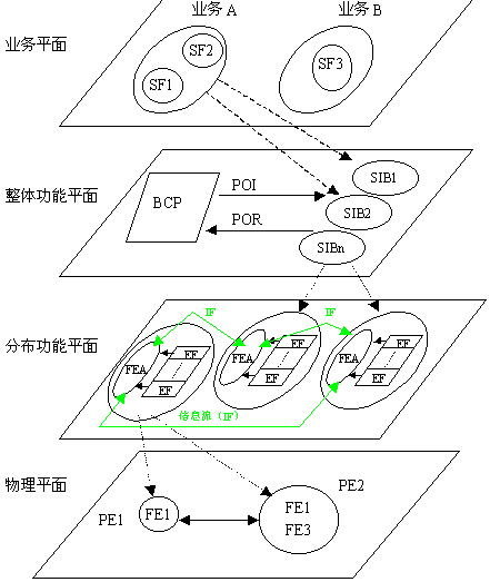 根據(jù)不同的抽象層次,智能網(wǎng)概念模型分為四個(gè)平面:業(yè)務(wù)平面、整體功能平面、分布功能平面、物理平面。