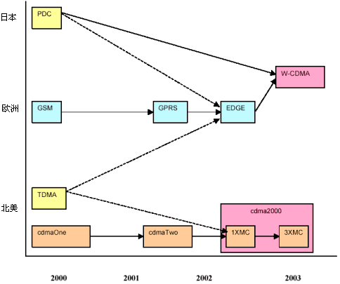 3G的基本問(wèn)題版本多。有兩種正在顯現(xiàn)的3G標(biāo)準(zhǔn)。盡管從技術(shù)上講,它們都屬于CDMA的范疇,但是在現(xiàn)實(shí)中(從實(shí)施的觀點(diǎn)上看),它們并不相同。如圖4所示,cdma-2000(1XMC繼之以3XMC)是cdmaOne和cdmaTwo的接替者。類(lèi)似地,W-CDMA是GSM的接替者。每一種標(biāo)準(zhǔn)都能向后兼容其前輩,而且每一種體系結(jié)構(gòu)都提供了與其他結(jié)構(gòu)的接口。