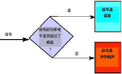 聲學(xué)回聲的一般頻譜特征類似于語音的頻譜特征。類似地,聲學(xué)回聲路徑中的非線性特征會(huì)引起回聲和原始語音音節(jié)之間的不一致。因此,有效語音和對(duì)應(yīng)的聲學(xué)回聲之間的電平差異(振幅差異)提供了相應(yīng)的信息,使用該類信息,可將聲學(xué)回聲從主流語音中分離出來。在圖4中,給出了識(shí)別某一信號(hào)是有效信號(hào)還是聲學(xué)回聲信號(hào)所采用的邏輯方法的概念視圖。