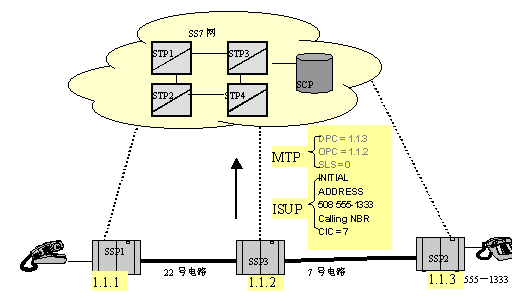 如下圖所示,當(dāng)一個(gè)用戶摘機(jī)并拔被叫號(hào)碼,交換局(SSP1)收集并分析被叫號(hào)碼,分析到被叫不是本局內(nèi)用戶,而是目的信令點(diǎn)編碼為1.1.3交換局的用戶,于是,SSP1在路由表中查找到達(dá)1.1.3的路由,然后用找到的鏈路把IAM消息發(fā)送出去,如圖中箭頭所示。