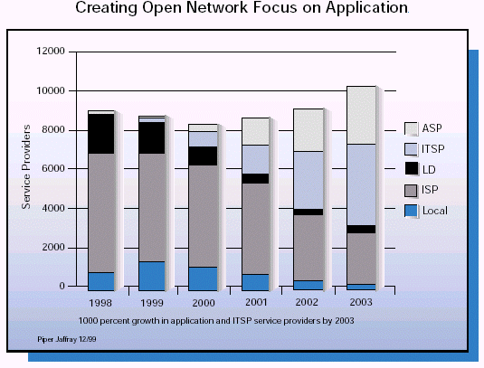 長(zhǎng)距離時(shí)間日漸商品化。業(yè)務(wù)提供商不斷地尋求更高價(jià)值的,與眾不同的業(yè)務(wù)來幫助他們提高消費(fèi)者的滿意度和吸引新的客戶。新一代的業(yè)務(wù)提供商會(huì)在帶寬上依賴于第三方的運(yùn)營(yíng)商,在Internet和語音服務(wù)器的基礎(chǔ)設(shè)施上依賴于托管業(yè)務(wù)提供商。而他們自己的精力將會(huì)主要放在建立一個(gè)本地接入上