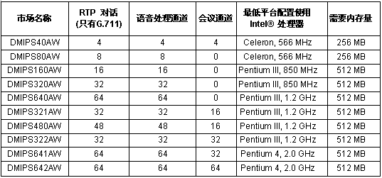 為了讓客戶根據(jù)需要可以選擇不同媒體處理資源的組合, HMP軟件提供一系列的資源配置. 這些資源配置列在下面, 包括它們的市場(chǎng)名稱,