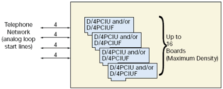 D/4PCIU和D/4PCIUF板卡安裝在計(jì)算機(jī)里(基于Pentium? 處理器的PC) ,可以提供4到64線的集成的,不使用CTbus總線的語(yǔ)音解決方案。