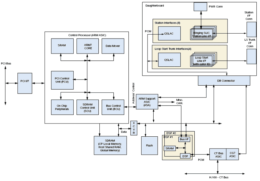 DSPs 直接有PCM連接到CTbus ASIC, 它提供SCbus/CTbus(H.100)和模擬座席接口之間PCM交換的功能.