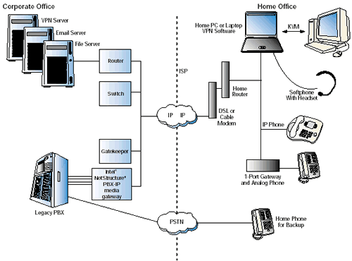 為了實現(xiàn)這個VoIP解決方案,PBX-IP網(wǎng)關連接到了辦公室里的原有的PBX和關鍵系統(tǒng)上,還有網(wǎng)守軟件實現(xiàn)一些呼叫的路由以及地址轉換。然后遠程辦公者連接到了網(wǎng)關上--最終連接到公司PBX上--或者使用IP軟電話,或者一個實際的IP電話,或者一個單端家庭網(wǎng)關連接到模擬耳機上。