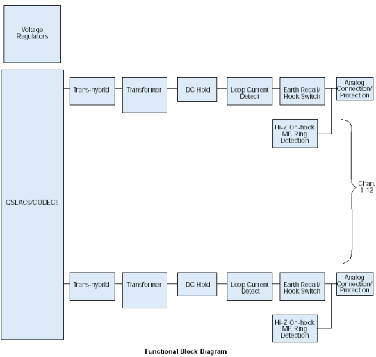 來自12個環(huán)路電話線的信號首先通過電話線路接口連接到D/120JCT-LS板卡上,該接口提供瞬變保護(hù)和電磁干擾(EMI)刪除(參見子板塊圖)。這些電話線路接口使用可靠的晶體摘掛機開關(guān)(無機械接觸)和FCC-Part
