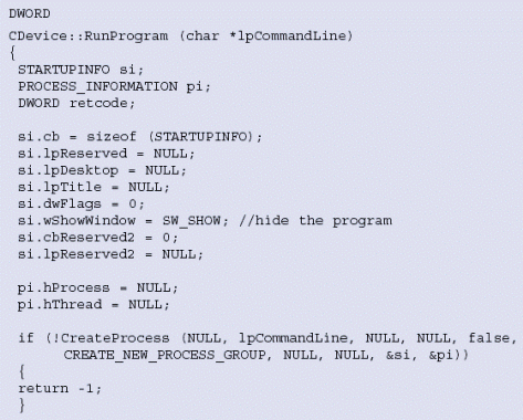 圖7中的函數(shù)RunProgram()顯示了一種產(chǎn)生Windows進(jìn)程,然后等待該進(jìn)程執(zhí)行完成的方式。