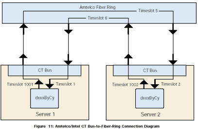 為了能夠共享時隙,將本地服務器上的CT總線連接到Amtelco光纖環(huán)路,然后從光纖環(huán)路連接到另外一個服務器的本地CT總線。圖11是一個簡單圖示,顯示了一個服務器1上的中間設備(dxxxBxCx)到另外一個服務器2上的中間設備(dxxxBxCx)的連接。