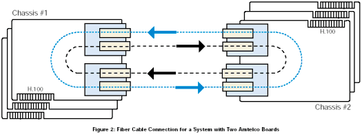 該配置由兩個服務器組成,其中一個配置成主機,另外一個配置成客戶機。主機通過光纖環(huán)路為整個系統(tǒng)提供時鐘,客戶機則通過光纖環(huán)路得到時鐘。對于主機服務器,Amtelco卡需要在Dialogic®