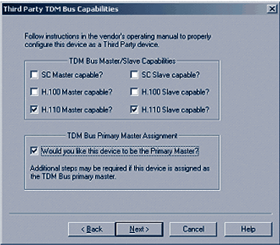 現(xiàn)在需要選擇合適的TDM總線的功能,對合適的類型(對于PCI,選擇H.100,對于CompactPCI,選擇H.110),您需要選擇主選項和客戶端選項。如果該設備將要為CT總線(客戶端服務器)提供主時鐘,選中TDM總線主控制選項,然后單擊下一步。圖5顯示的是CompactPCI服務器在系統(tǒng)中配置為客戶端服務器的選擇。