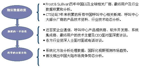 Frost & Sullivan 和 CTI論壇(m.jubaoshijie.com)共同組成的調(diào)研小組,在查閱了大量資料的基礎(chǔ)之上,以企業(yè)通信及呼叫中心的設(shè)備應(yīng)用、投資計劃以及相關(guān)廠商的市場表現(xiàn)為出發(fā)點,通過對企業(yè)通信及呼叫中心重要應(yīng)用企業(yè)、在市場占主導(dǎo)地位的二十多家設(shè)備廠商、二十多家軟件開發(fā)商、十幾家系統(tǒng)集成商、數(shù)家外包運營商的深度訪談,參閱內(nèi)部相關(guān)報告及數(shù)據(jù)庫,對數(shù)據(jù)的來源和數(shù)據(jù)的準(zhǔn)確性進(jìn)行了詳細(xì)核對與論證;憑借參與調(diào)研人員的多年從業(yè)經(jīng)